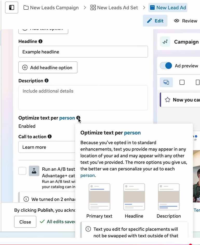This feature personalizes your ad for every individual user. Meta swaps your headlines and primary text based on what a user prefers. Some people respond to long-form stories; others want short headlines. Give Meta 5 options and let it choose.