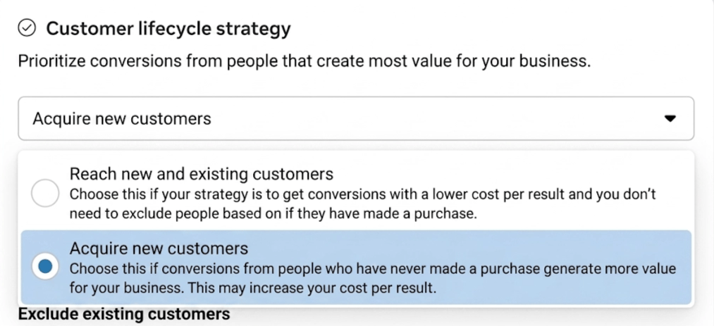Acquire new customers - tells Meta to exclude people who have already purchased from your business. The key detail here is that Meta is not doing anything mysterious to identify your existing customers. It is pulling directly from the Existing Customers audience segment you have already defined in your Advertising Settings. If that segment is not set up or is poorly defined, this exclusion will not be accurate.