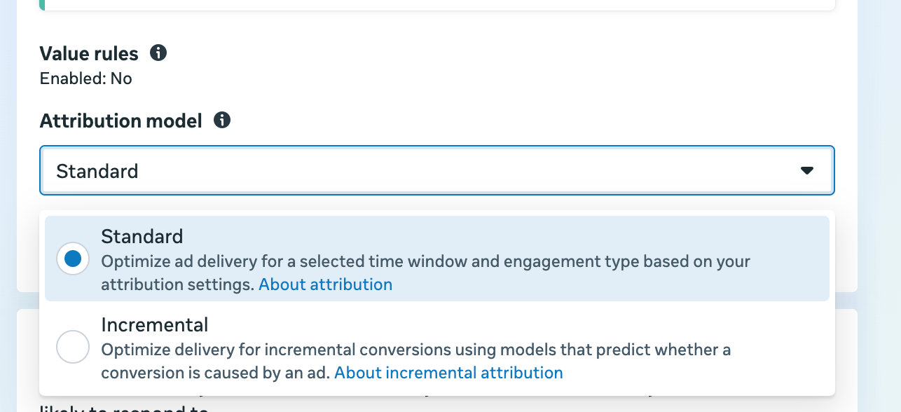 Standard attribution counts conversions that happen after a click or view within a defined window of time. It does not attempt to determine whether the ad actually caused the conversion. Incremental attribution uses Meta's predictive models to estimate whether a conversion was caused by seeing the ad, filtering out conversions that likely would have happened regardless.